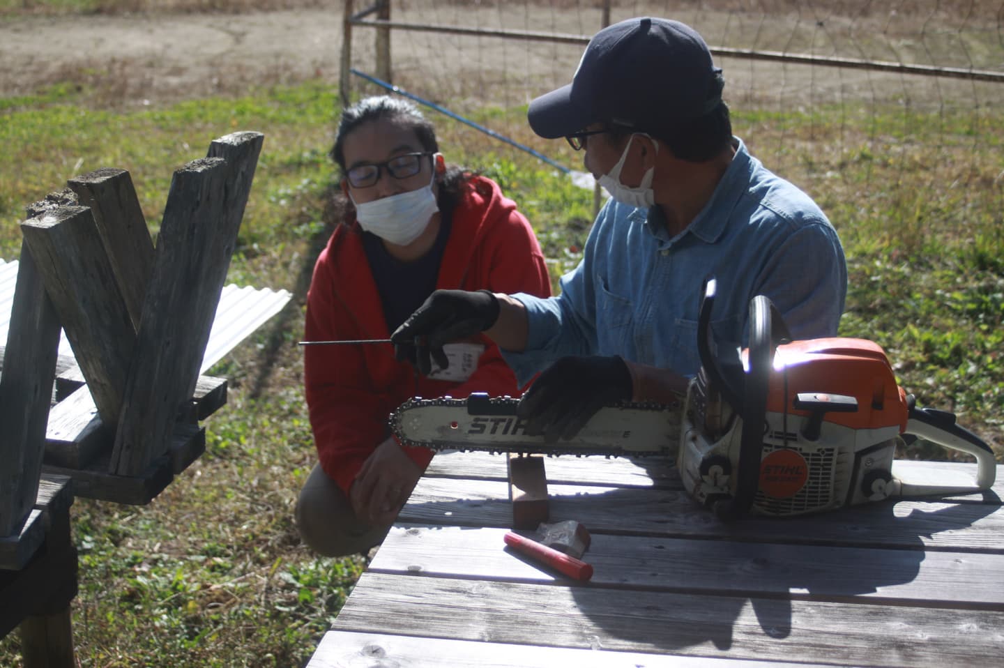 テーブルや倉庫・石窯や薪など、里がワンダーランドで使うものはみんなで手作りします。大人たちは様々な工具を使って初心者から経験者まで、みんなで作ります。子供たちも大人の人に教わって、自分たちのベンチや遊び道具を作ります。日々使う薪も、山から倒木を運び出し、チェーンソーで切って斧で割って…。